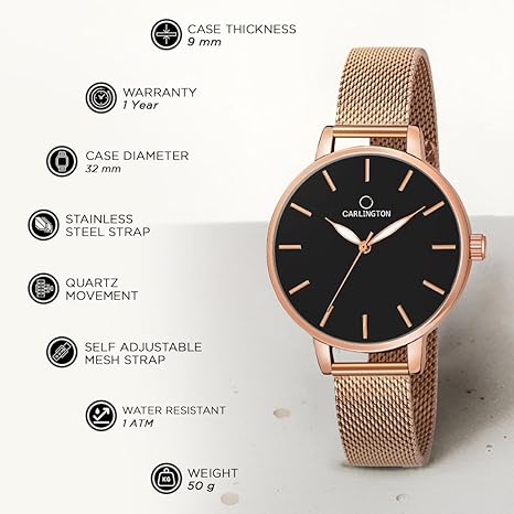 - FEATURE – With a 32 mm dial width and a 102 mm strap length, this watch strikes the perfect balance between comfort and style. The round dial is protected by a hardened scratch-resistant design, ensuring durability and longevity. Crafted with an alloy case material, this watch showcases a reliable 3-hand analog quartz movement and a secure closure, offering both precision and convenience.